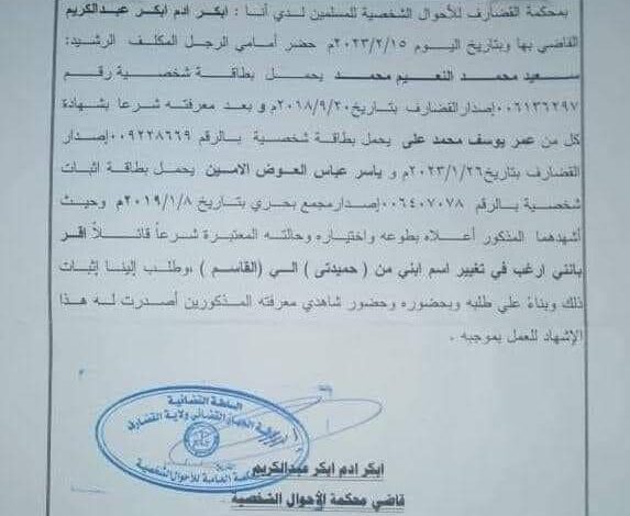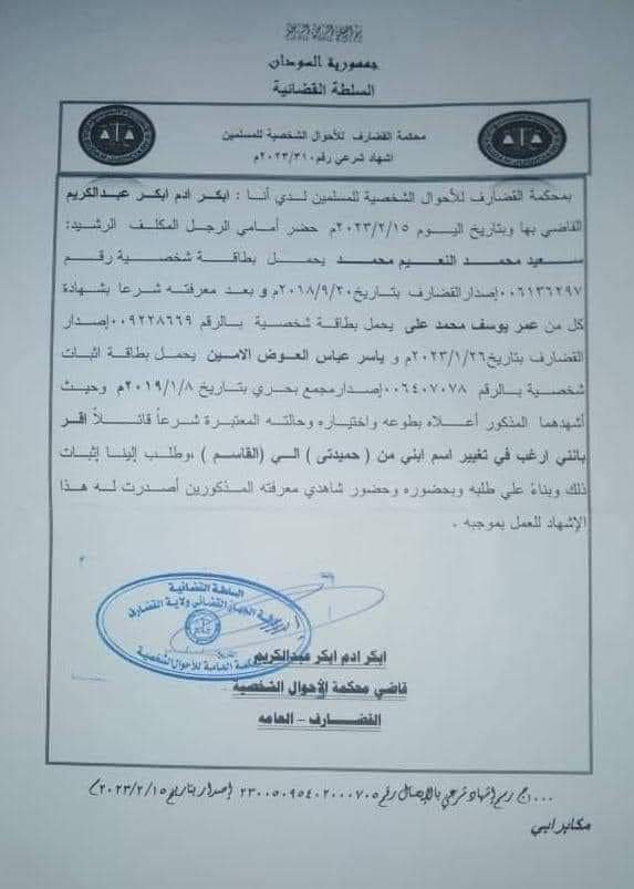 قضت محكمة الأحوال الشخصية بالقضارف حكم بتغيير اسم طفل كان قد اطلق عليه (حميدتي) إلى اسم القاسم بناء علي طلب تقدم به والد الطفل إلى المحكمة.
